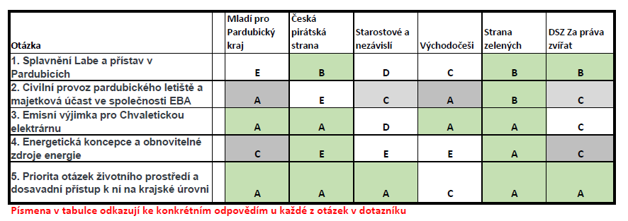 S naším hodnocením odpovědí na zeleno-šedé škále v tabulce nemusíte samozřejmě souhlasit - sami si ověřte, zda odpovědi strany nebo hnutí, kterou chcete případně volit, korespondují s Vašimi názory.