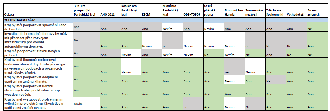 Pokud jste dočetli až sem, máme pro Vás malý bonus. Protože ve volební kalkulačce pro krajské volby, kterou asi většina z Vás zná, bylo letos témat životního prostředí poměrně dost, vyhodnotili jsme podle stejného schématu i tyto odpovědi stran. Volební kalkulačku pro krajské volby v Pardubickém kraji najdete zde: https://volebnikalkulacka.cz/cs/kraje-2020/?cc=pa